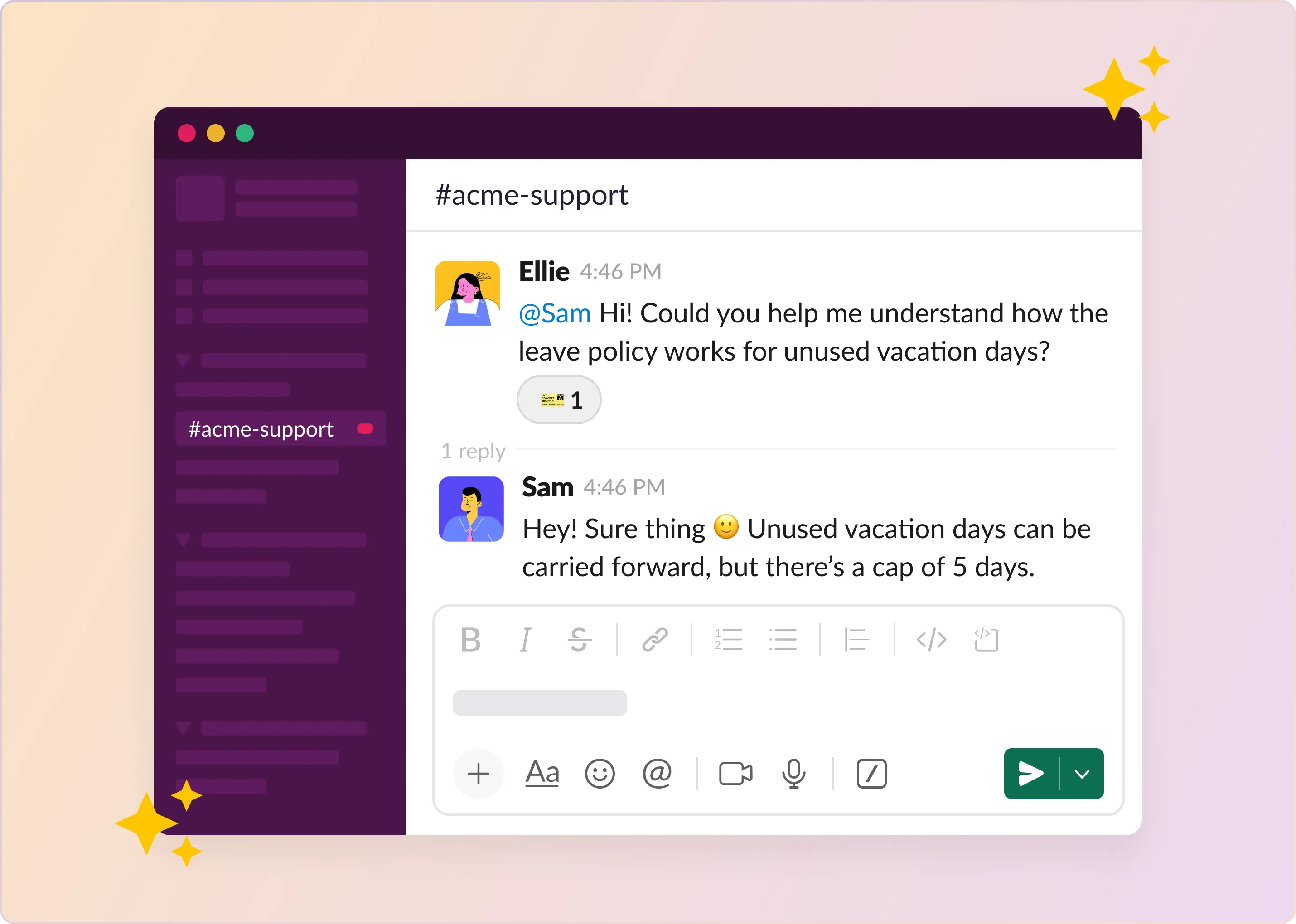 Slack brings an expectation of quick turnarounds – instant messaging = instant gratification. Support managers know that if you give customers a direct Slack channel, they may come to expect near-immediate responses at all hours. There’s a fear of agent burnout and alert fatigue. Imagine support reps glued to Slack, context-switching incessantly, and getting pinged at 9 P.M.Â