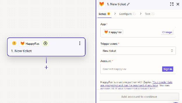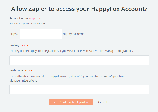 - Follow the prompts to connect your HappyFox account by providing the necessary credentials and API keys.