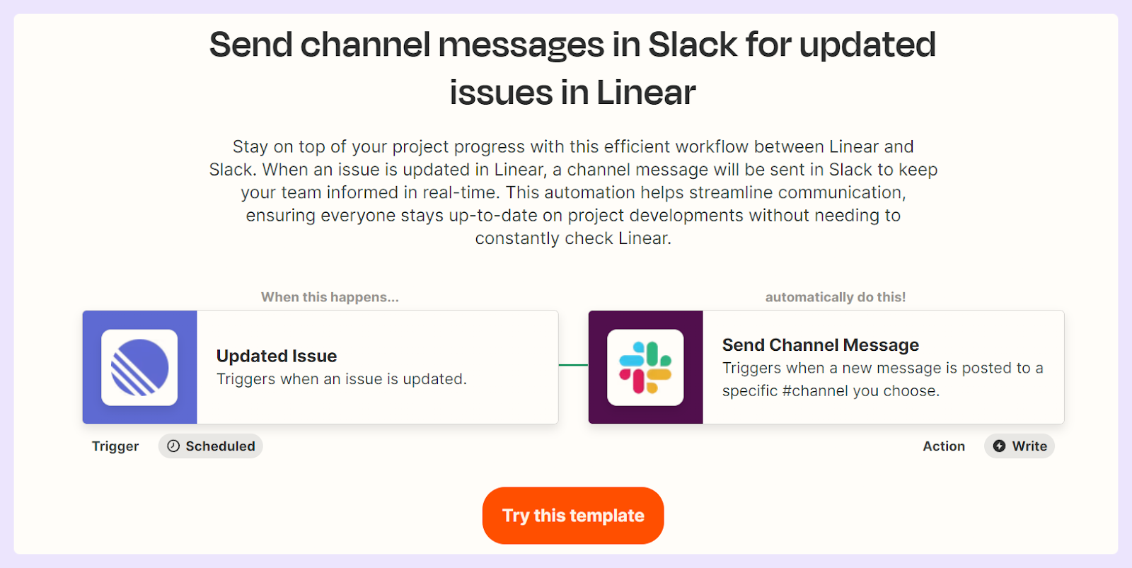 - Fine-grained control over notifications in Slack: Zapier offers fine-grained controls for Slack notifications from Linear (beyond Linear’s native offering). Whenever there's an update in Linear—such as a status change or a new comment—an automated message can be sent to a designated Slack channel.