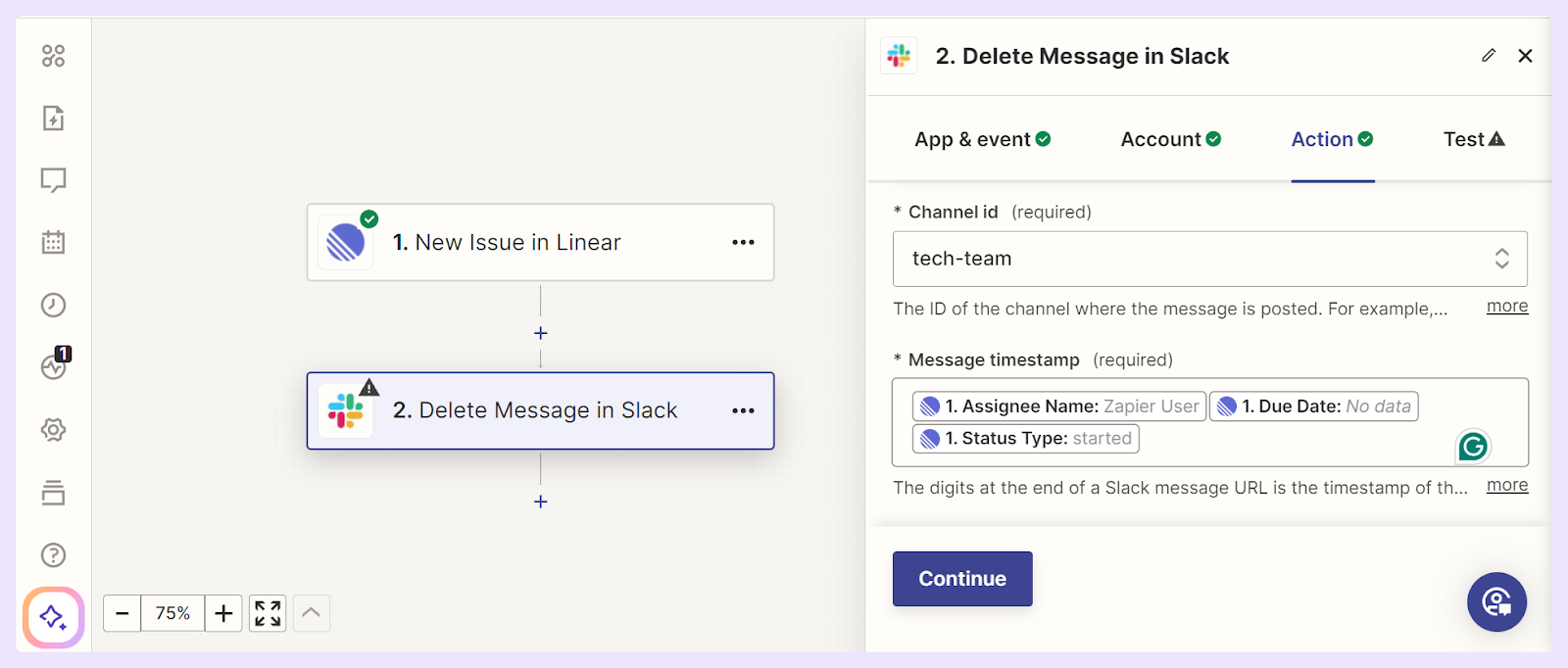 - Click Continue, save your settings, and run one more test to confirm your connect Linear to Slack workflow is working end to end.
