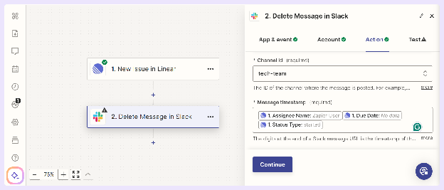 - Click Continue, save your settings, and run one more test to confirm that your Linear-to-Slack workflow is working end-to-end.