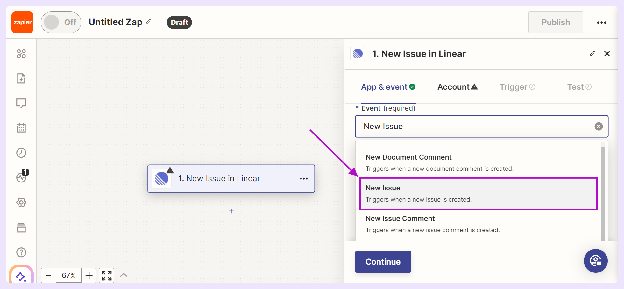 - Log in to Zapier, search for the Linear app, and select New Issue as the event for your Zapier Linear integration.