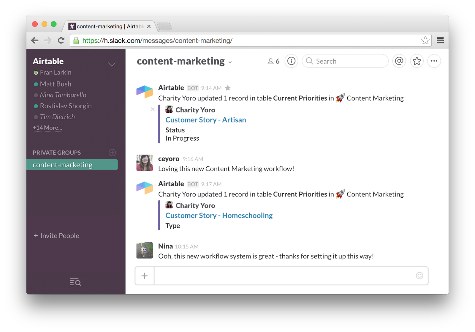 Instead of Slack being a place where people only talk about work, Airtable’s integration helps Slack become a place where work gets updated, tracked, and nudged forward with AI.