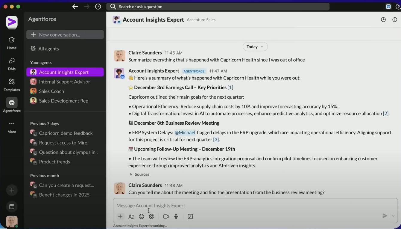 If you are looking for a Slack AI integration that goes beyond summaries and helps teams take action, Agentforce 2.0 is the solution. It brings Salesforce’s agent capabilities into Slack so teams can handle questions, route work, and automate common workflows directly in channels and DMs.Â