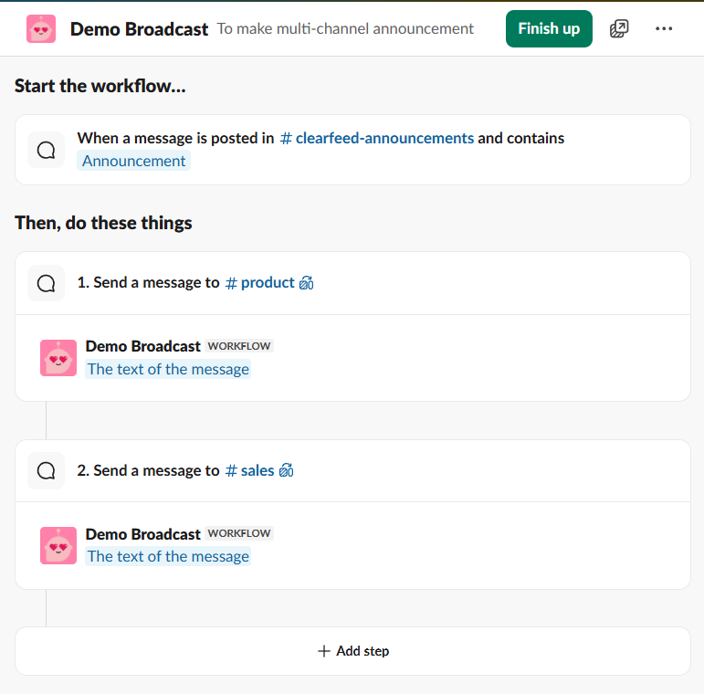 The screenshot shows how this workflow can take an announcment in one channel and post it to #product and #sales. We can keep adding more steps and more channels. As we can see, it's a little painful to put this workflow together: