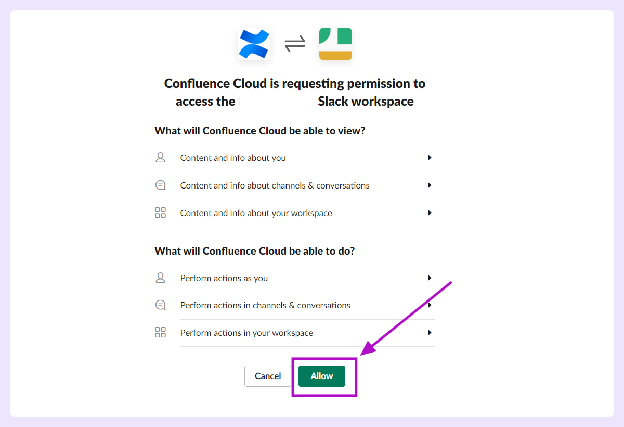 - Select the Slack workspace where you want to install the Confluence Cloud app.