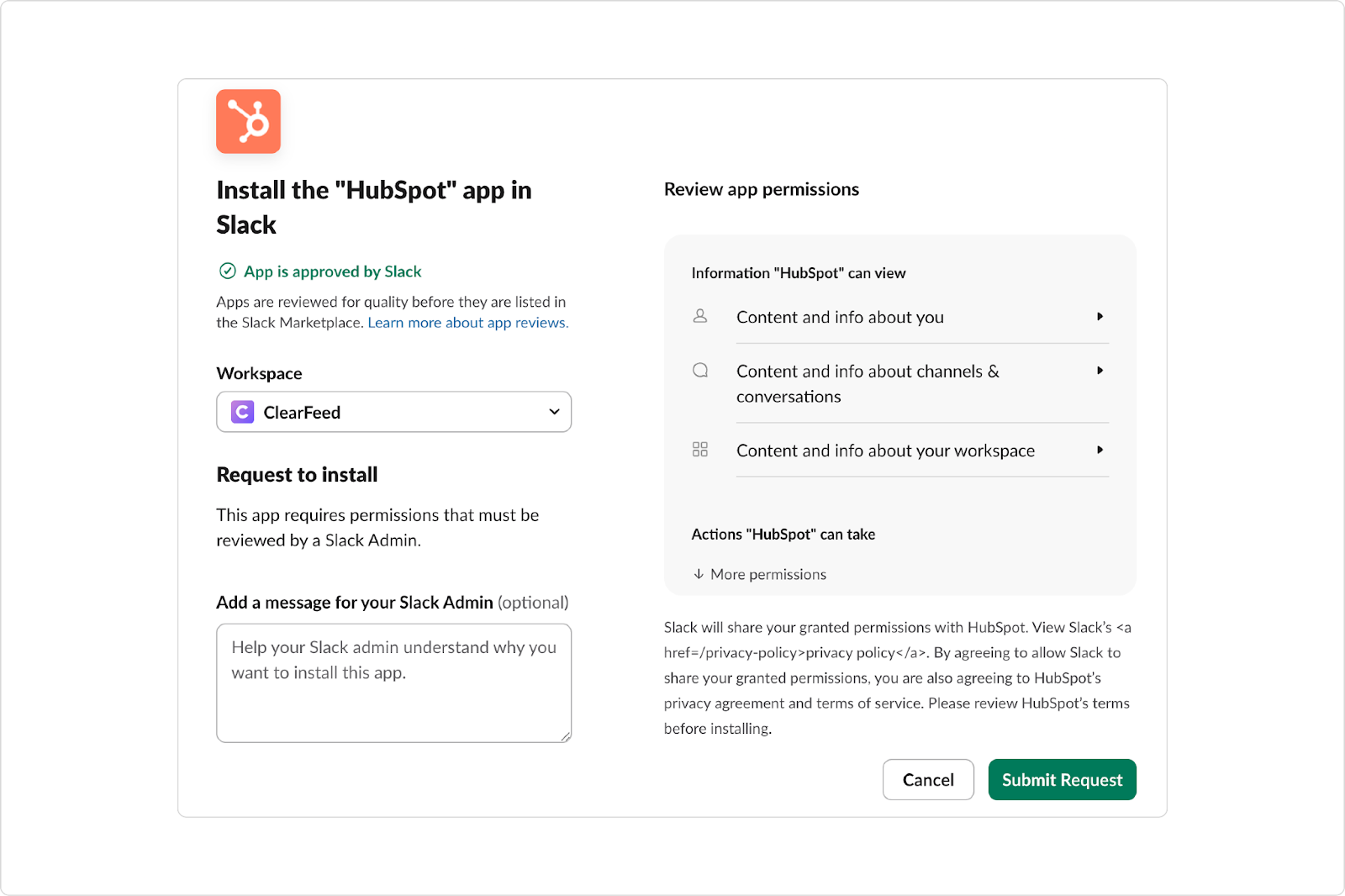 - You will also receive a Slack message confirming that you have requested that the admin allow the HubSpot app for your workspace. Once approved, you will be able to create HubSpot tickets, convert Slack messages to HubSpot notes, etc.