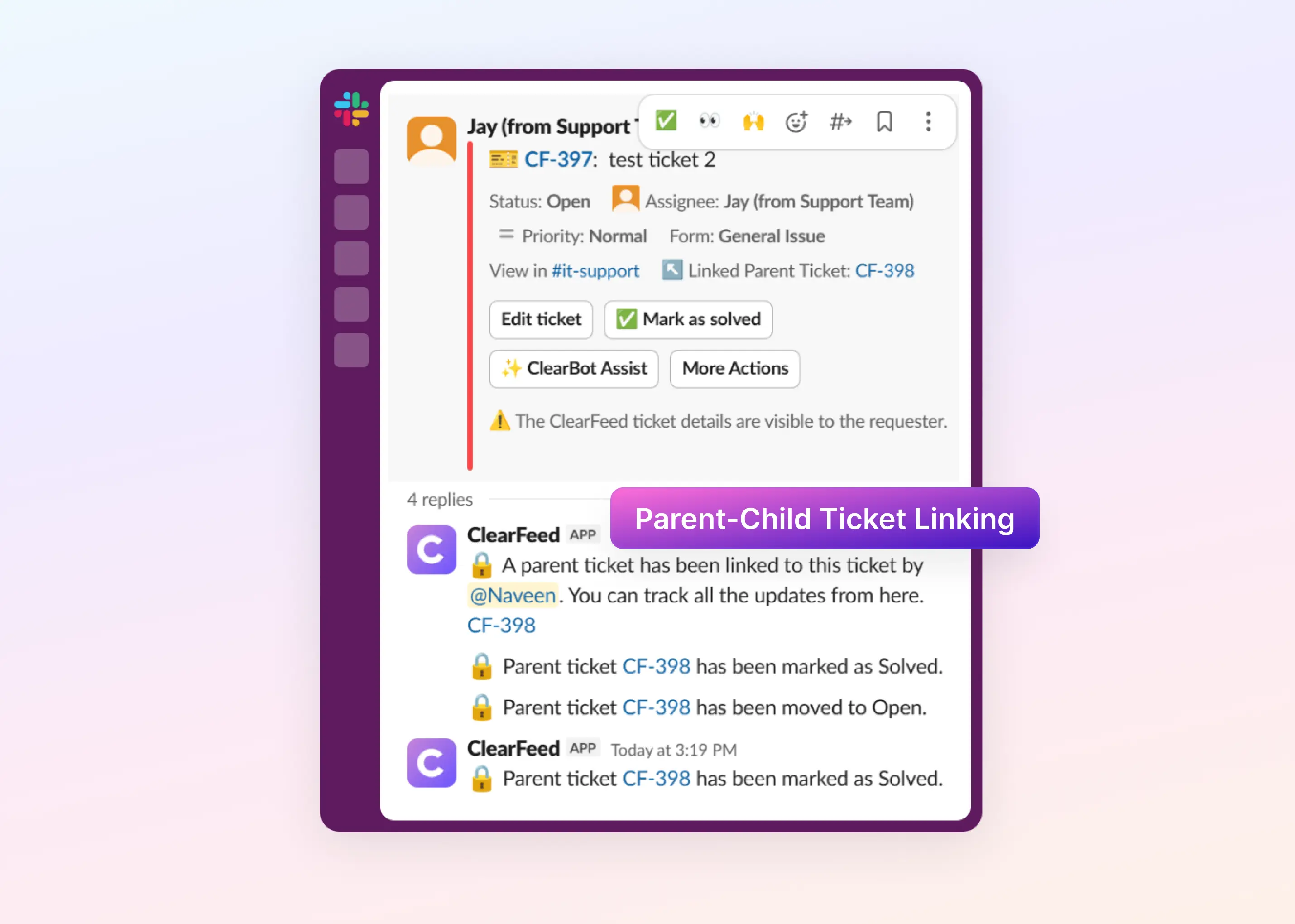 This is where ClearFeed comes in — by going beyond basic alerts, it brings richer workflows, deeper integrations, and AI-driven automation directly inside Slack, helping teams overcome many of the limitations of the native Kandji integration.