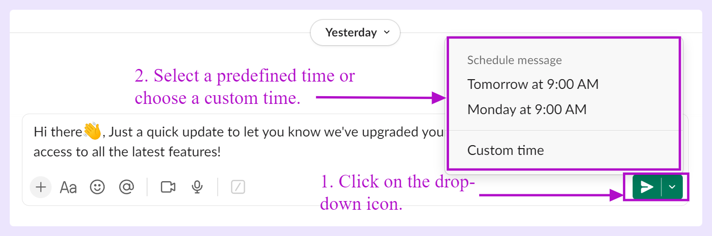By scheduling your Slack messages in advance, you can work when it suits you best and avoid being glued to your screen 24/7. No more racing against the clock in different time zones. No more constant interruptions derailing your focus. Scheduled messages let you plan your workday and collaborate smoothly with colleagues worldwide.