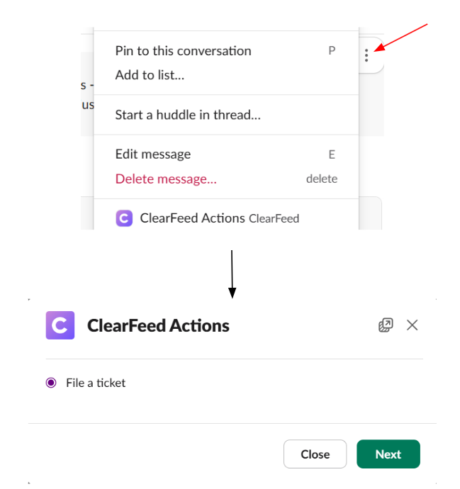 menu on hovering over a message in Slack. Ticketing vendors provide an Action to convert the DM to a ticket. A great Slack-native solution would automatically create a thread for the Ticket requester and keep it in sync with the Ticket comments and status.